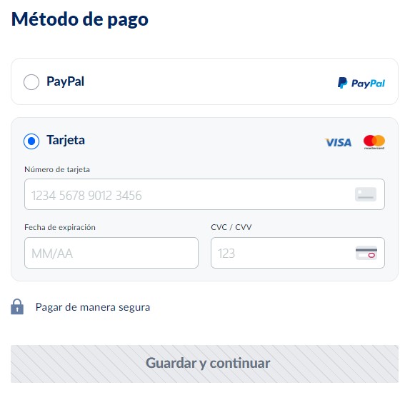 Una vez introducidos los datos de tu tarjeta (o Paypal), haz clic en Guardar y continuar.